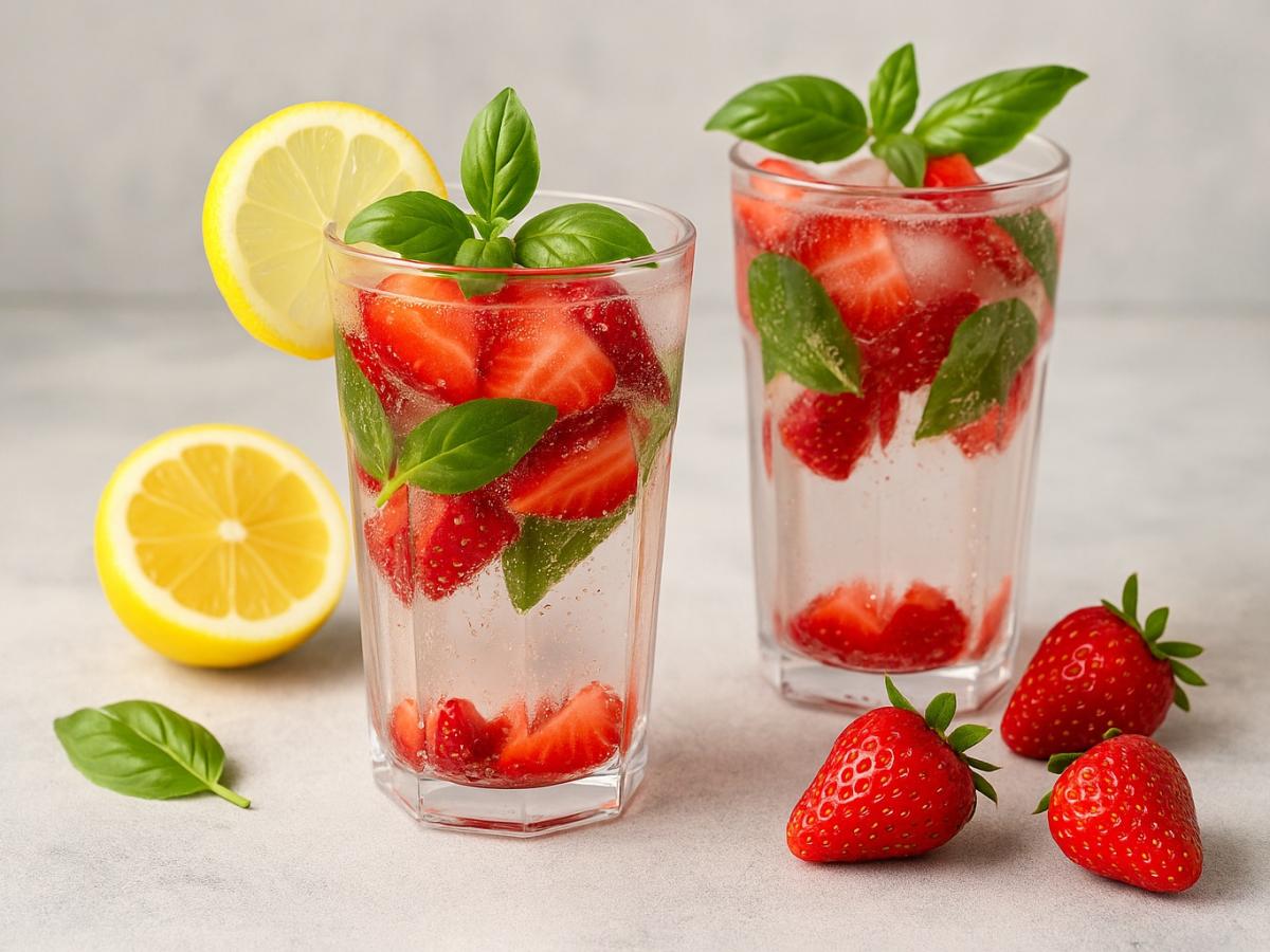 Разлейте по бокалам, украсьте веточкой базилика и кусочками клубники. Подавайте сразу, пока напиток остаётся искристым и холодным.