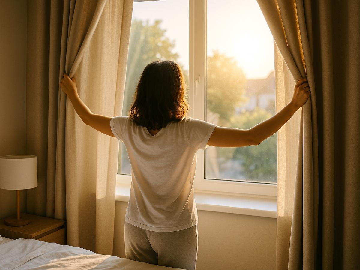 Начинайте день при естественном свете. Откройте шторы, выйдите на балкон или в сад — даже 10 минут дневного света запускают биочасы.