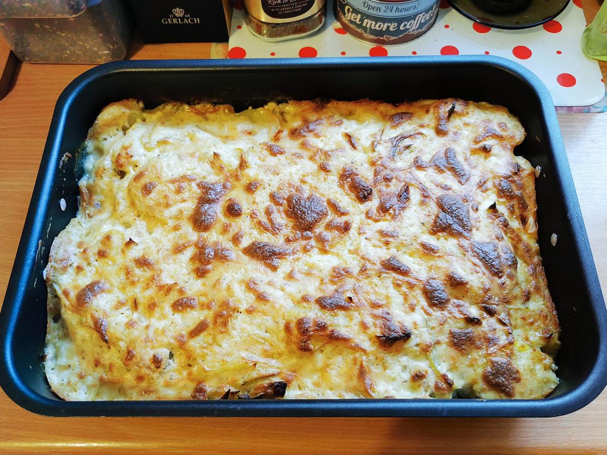 Перед тем как отправить запеканку в духовку, добавьте ложку сметаны или майонеза между слоями. Это сделает блюдо особенно нежным и пропитанным.