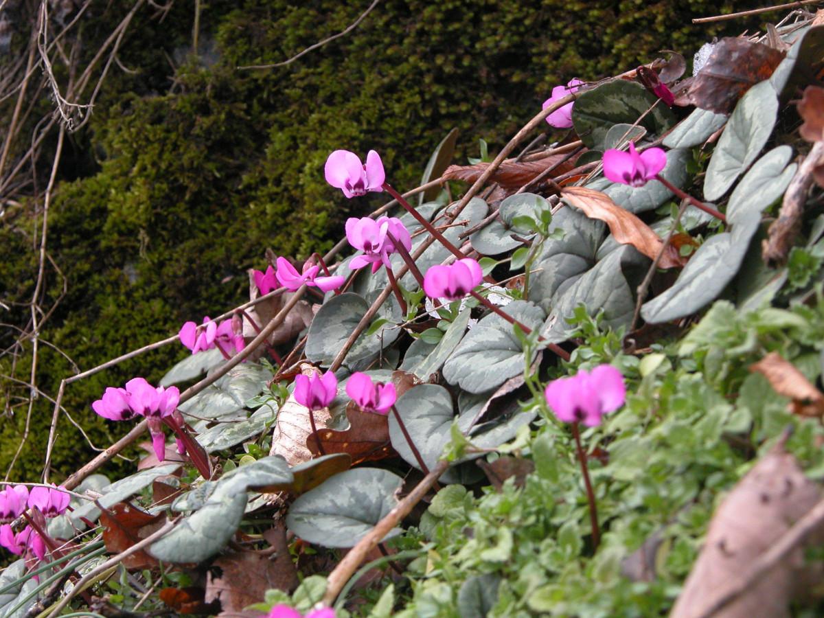 Харди-цикламен украшает зимний участок миниатюрными цветками самых разных оттенков — от белых до насыщенно-розовых. Компактный размер позволяет использовать его в качестве почвопокровного растения, которое оживляет тенистые зоны.