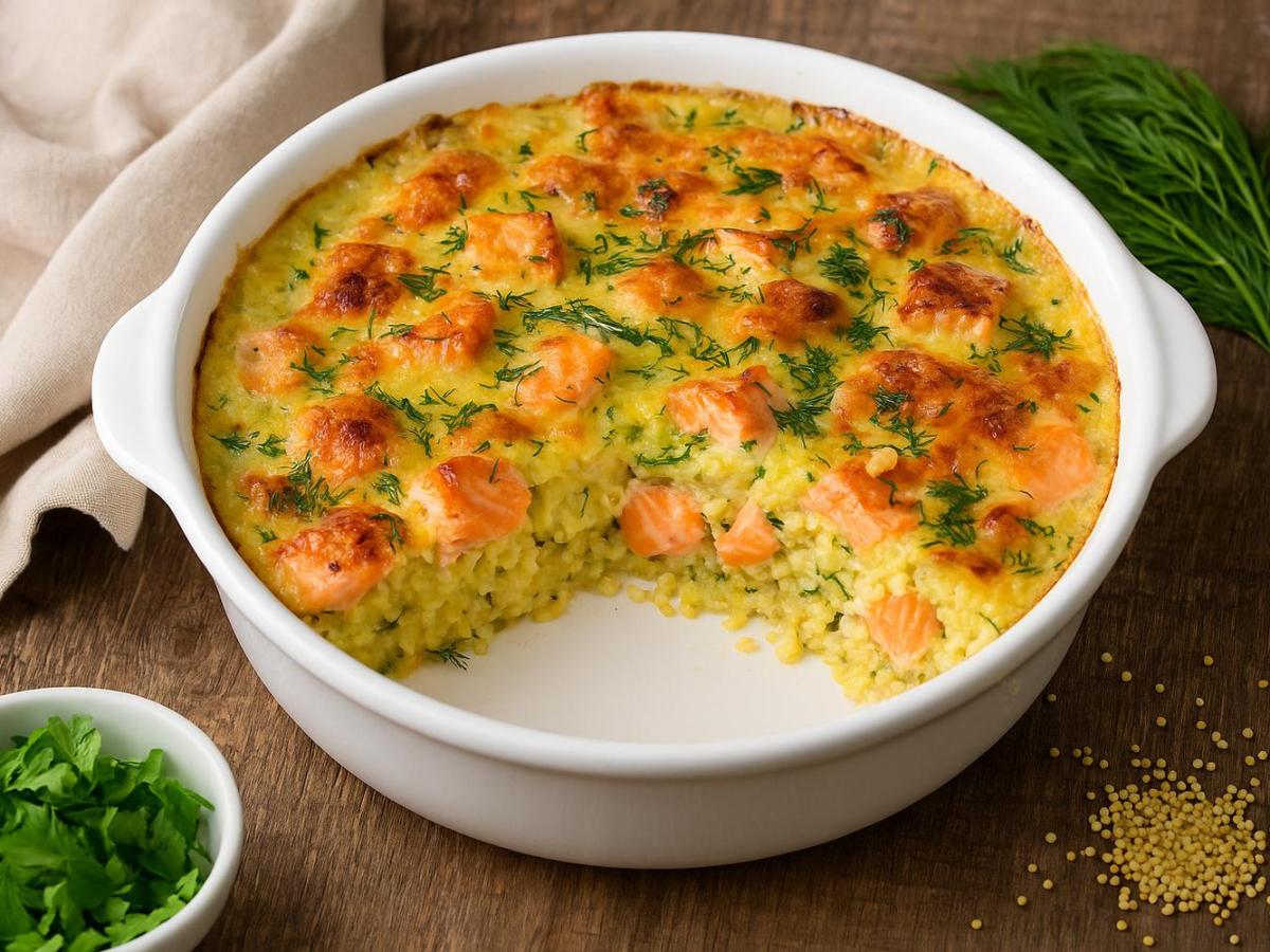 Пшено в русском доме — это не только каша. Добавьте к нему розовый кусок свежего лосося, немного зелени и сливок — и вы получите настоящее кулинарное сокровище. Летняя запеканка с северным характером: питательная, простая, но не скучная.