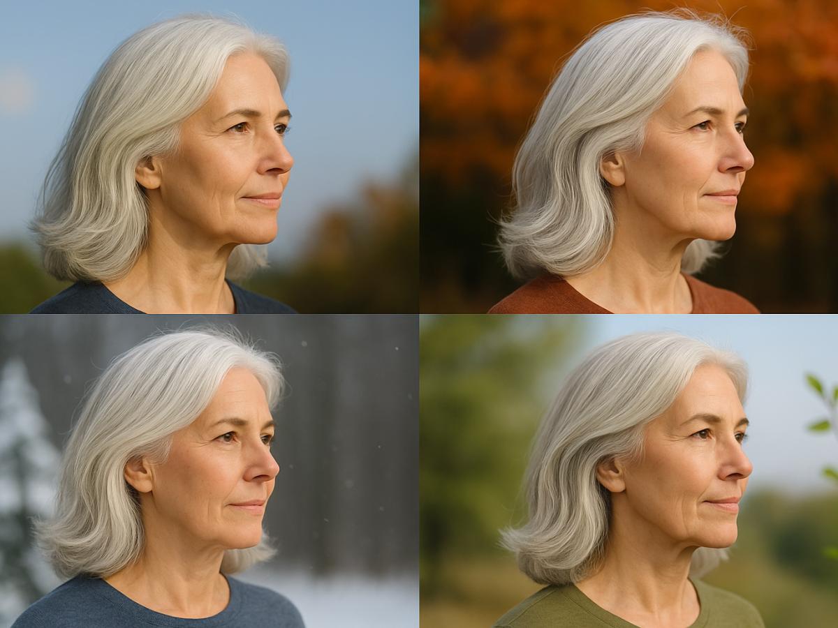 Осенью и зимой, когда в одежде преобладают тёмные оттенки, седые волосы становятся главным акцентом образа. На фоне шерстяных пальто и кашемировых свитеров они выглядят особенно утончённо. Весной и летом серебристые тона гармонируют с лёгкими тканями и открытыми линиями лица, создавая эффект свежести.
