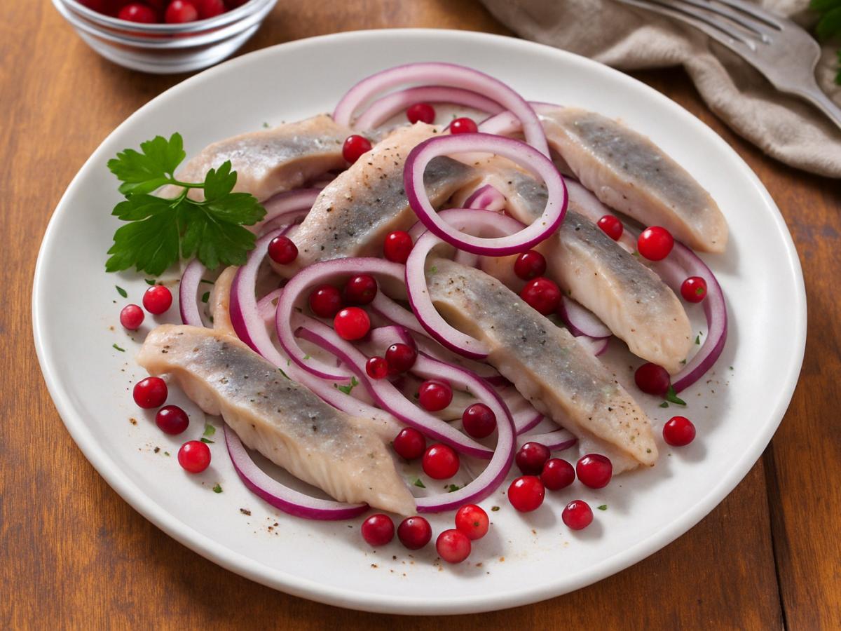 Солёная сельдь с луком и брусникой — это не просто классическая закуска, а тонкий баланс традиции и современности. Здесь узнаваемый вкус сельди встречается с неожиданной свежестью ягод и лёгкой кислинкой, превращая привычное блюдо в гастрономическое открытие.